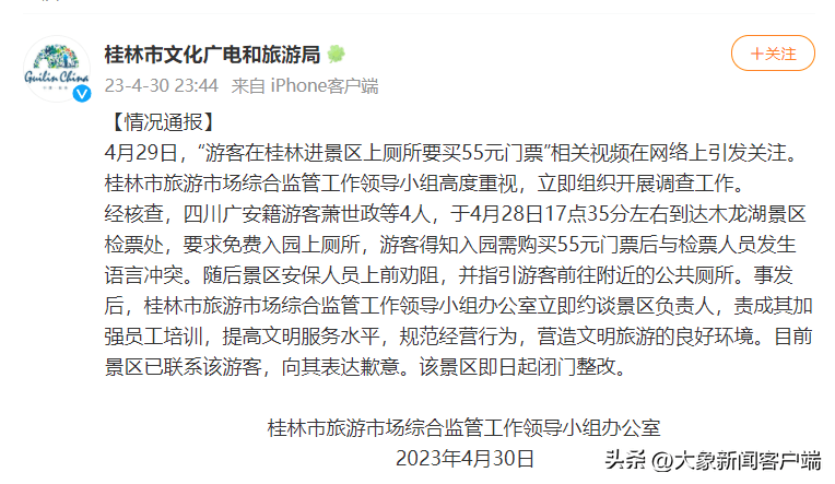 4月30日深夜,桂林市文化广电和旅游局通报称,木龙湖景区即日起闭门整改。