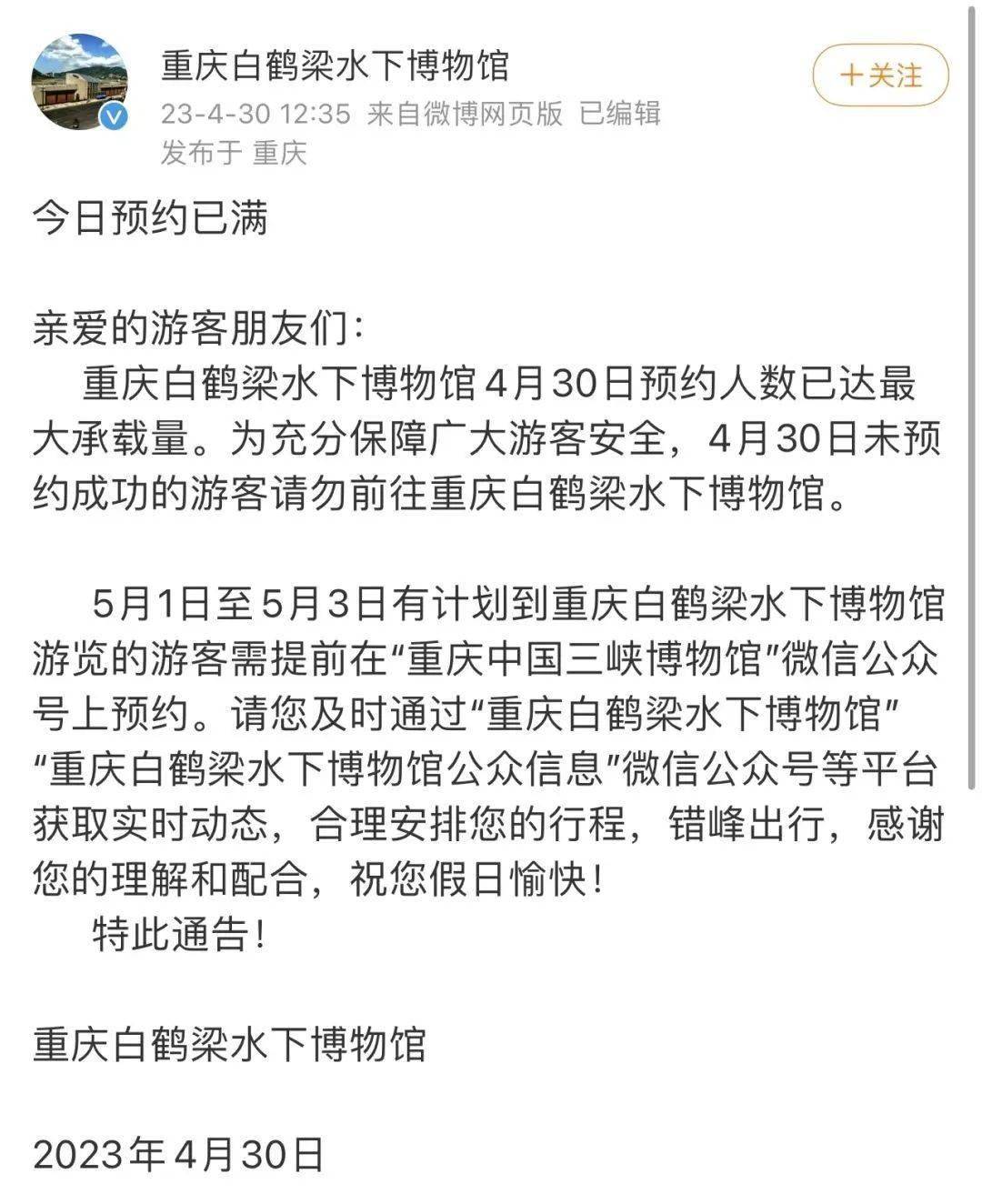 其中,南宁市动物园和重庆白鹤梁水下博物馆 4月30日中午12时30分左右发布的消息均表示,当日游客或预约人数达最大承载量,建议游客改日游览。