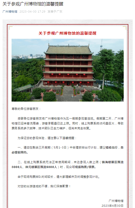 4月30日,广州博物馆也发布提醒:五一假期第二天,广州博物馆已迎来客流高峰,游客承载量已达上限。同时,线上购票系统访问量巨大,导致票务系统多次故障,技术团队已全力维护,但尚未完全恢复。