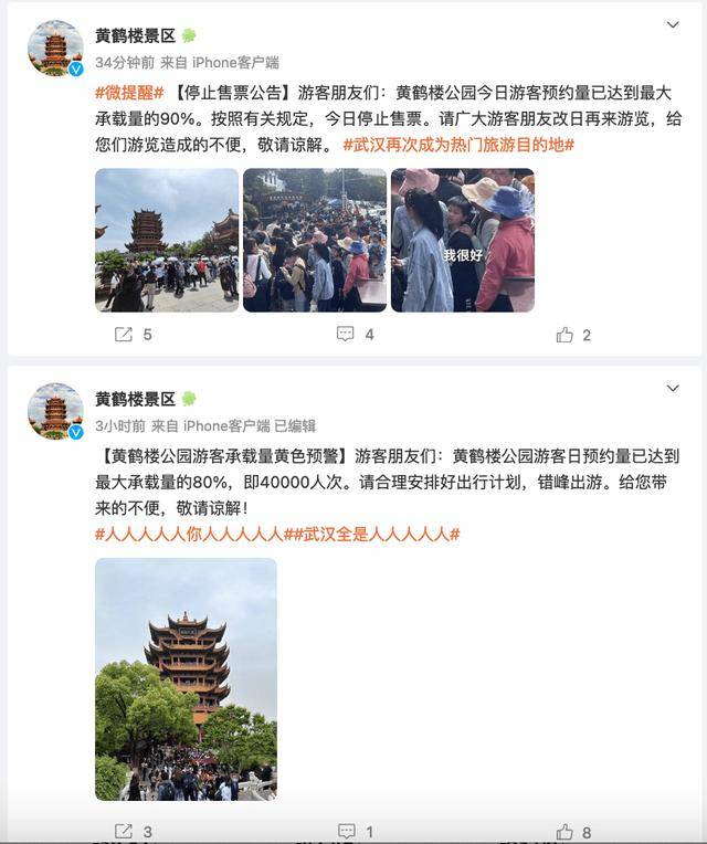 4月30日上午10时,武汉黄鹤楼景区发布公园游客承载量黄色预警,称黄鹤楼公园游客日预约量已达到最大承载量的80%,即40000人次。并带上#人人人人人你人人人人人#和#武汉全是人人人人人#两个话题标签。