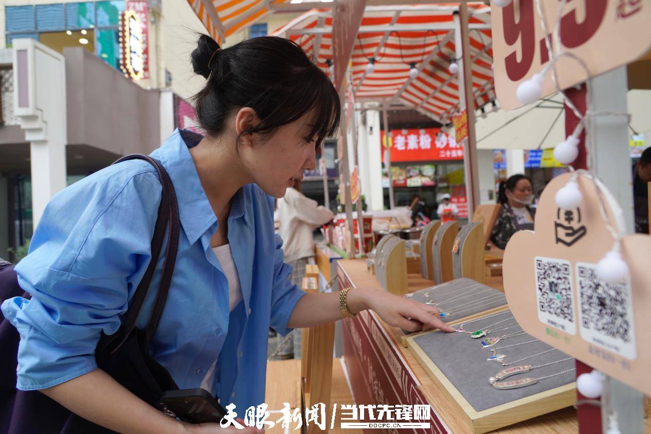 游客挑选十字街文创饰品