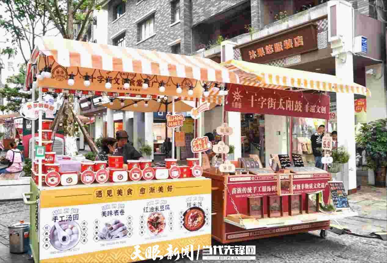 “五一”假期来临,在花溪区十字街花阁路集市上,“十字街文创食堂”和“十字街非遗文创”两个推广点吸引了不少游客驻足,独特的“十字街文创”招牌让大家充满了好奇。