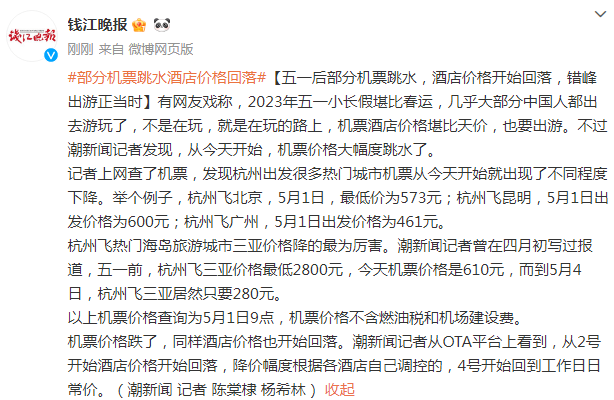 有网友戏称,2023年五一小长假堪比春运,几乎大部分中国人都出去游玩了,不是在玩,就是在玩的路上,机票酒店价格堪比天价,也要出游。不过潮新闻记者发现,从今天开始,机票价格大幅度跳水了。