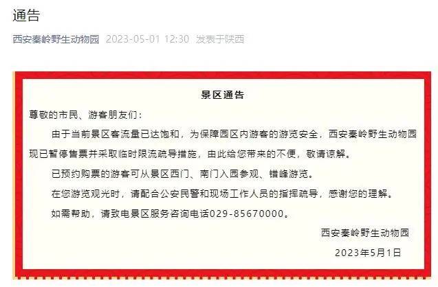 由于当前景区客流量已达饱和,为保障园区内游客的游览安全,西安秦岭野生动物园现已暂停售票并采取临时限流疏导措施,由此给您带来的不便,敬请谅解。