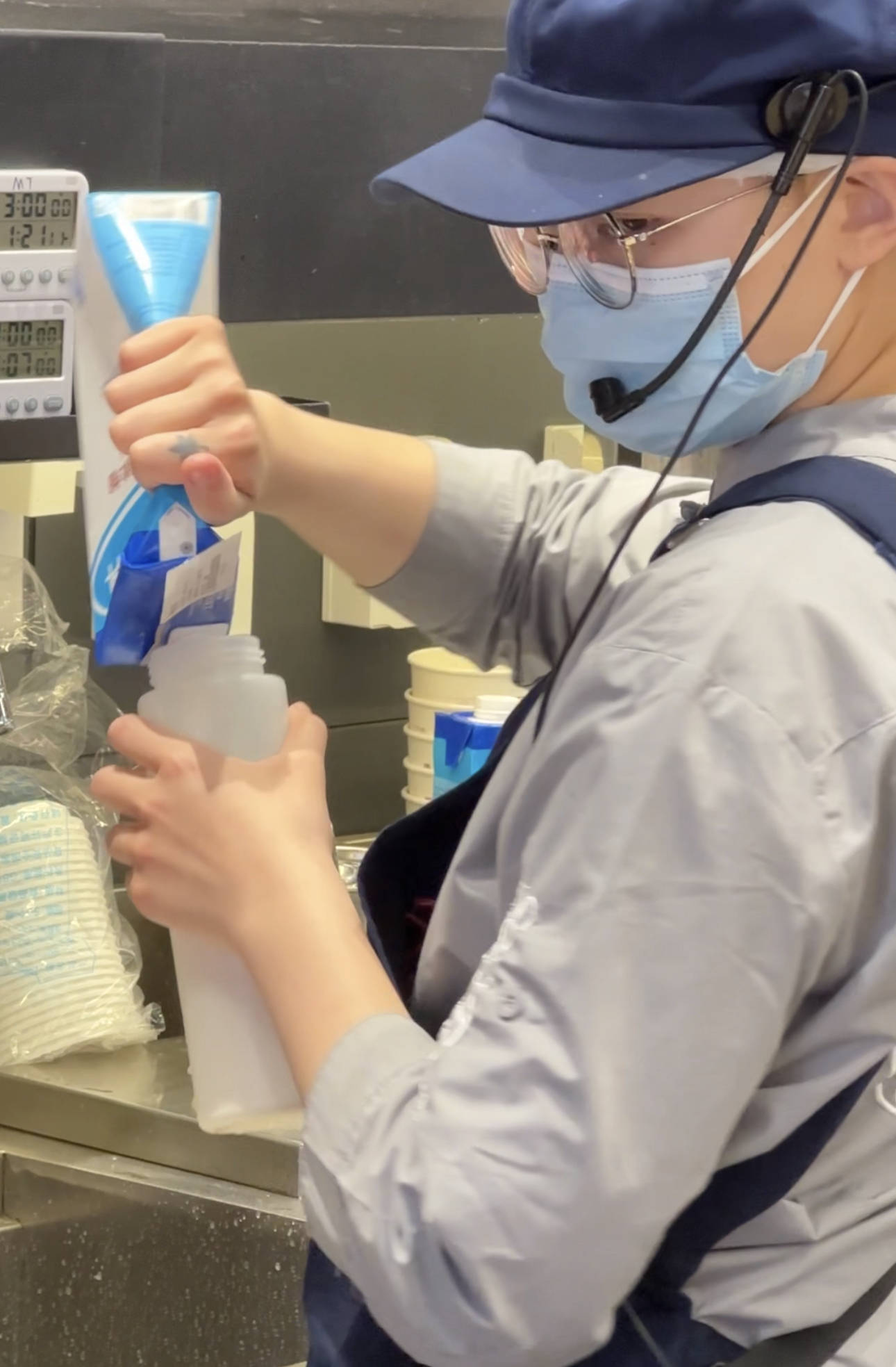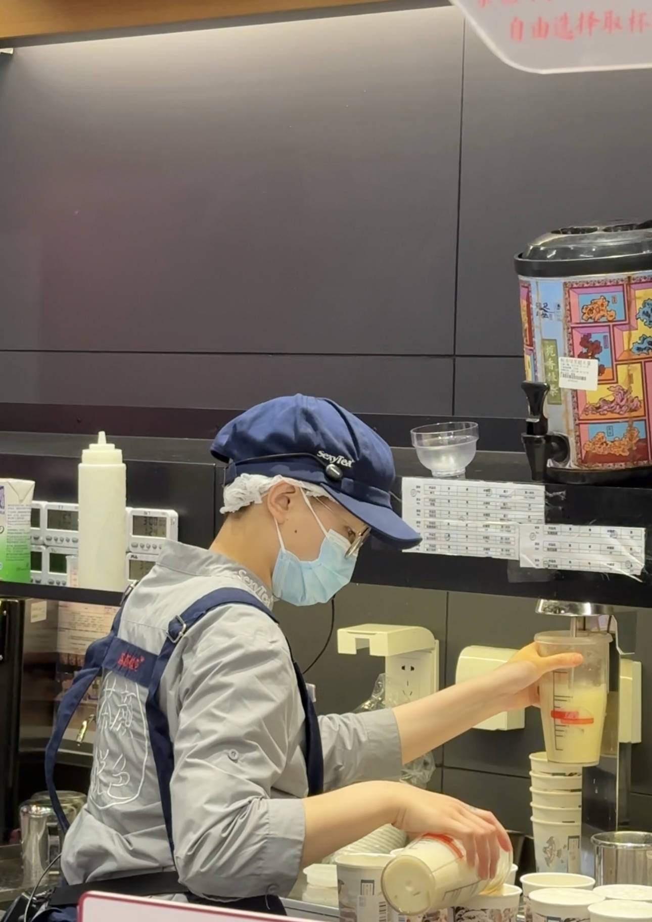 小韩每制作好一杯奶茶就要清洗用具,一个小时内她要清洗上百遍,水龙头打开又关上,水流声响起又消失,为了保证奶茶的干净卫生,这一步不可省略缺少,以至于她的手总是湿漉漉的。