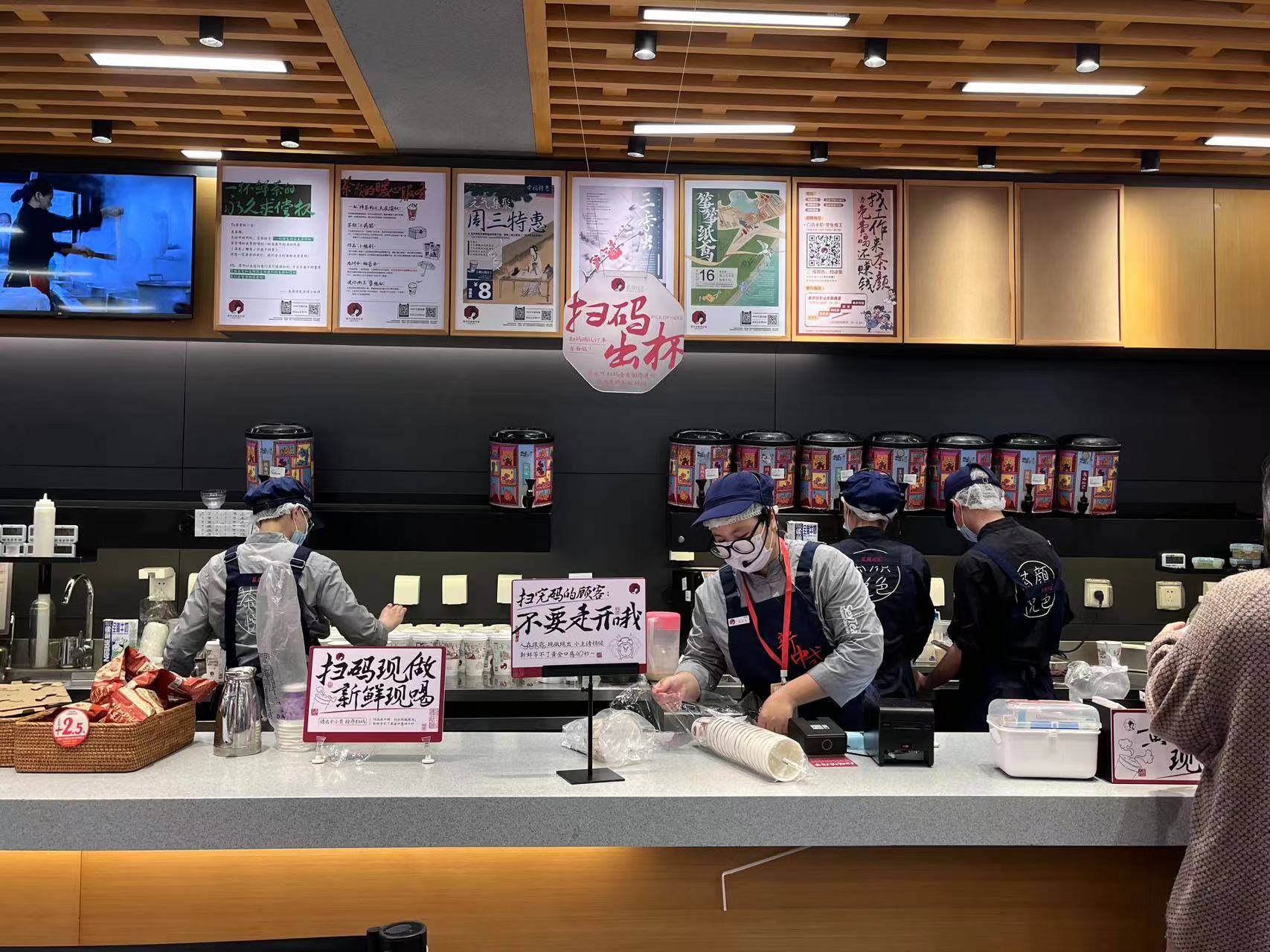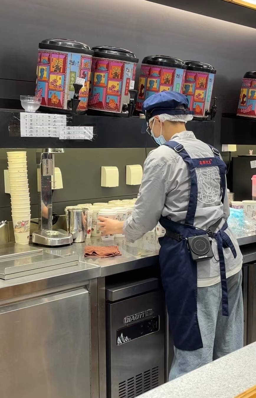11点,门店准时开门,已经不少游客等在门外,有的游客甚至拖着行李箱赶来排队,也许茶颜悦色是他们来到长沙打卡的第一站。店里开始变得喧闹,小韩只坚守在这狭小的一隅,严格把控着每一杯奶茶,倒茶、加冰、填奶、萃取,每一个步骤熟练又仔细,她面前的杯子已经摆满一片,但她依旧有条不紊,门店里的其他店员和她一样忙碌,有的在忙着装杯打包,有的在招呼客人取杯,有的拿着试喝产品游走在队伍中邀请客人品尝,水吧操作的砰砰声和外场的喧嚣声交织在一起。