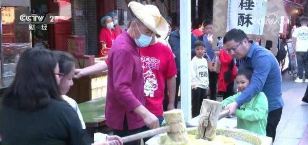 在这条街区,你还可以找到各种陕西特色美食的身影。这种色泽金黄的美食叫陕北小米酥,现场制作,入口酥脆。这个“五一”假期,很多游客一路逛一路吃,走的时候还会给家里人带上几盒。