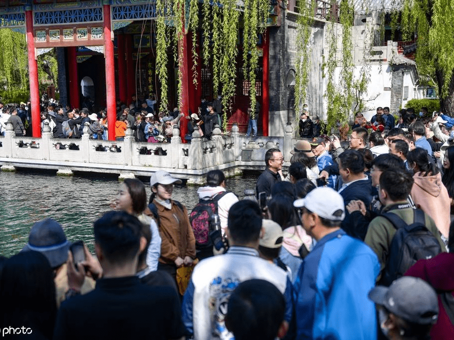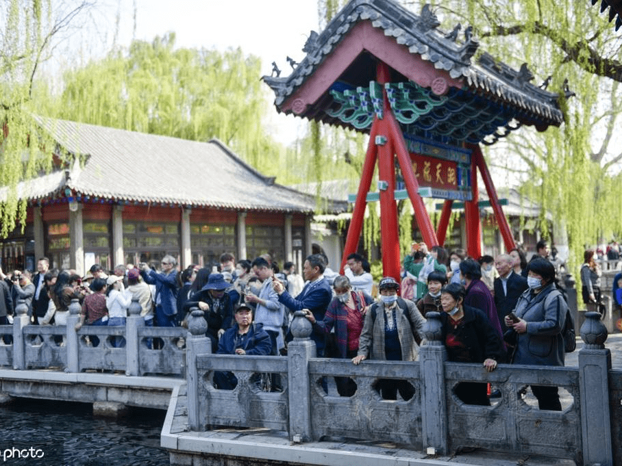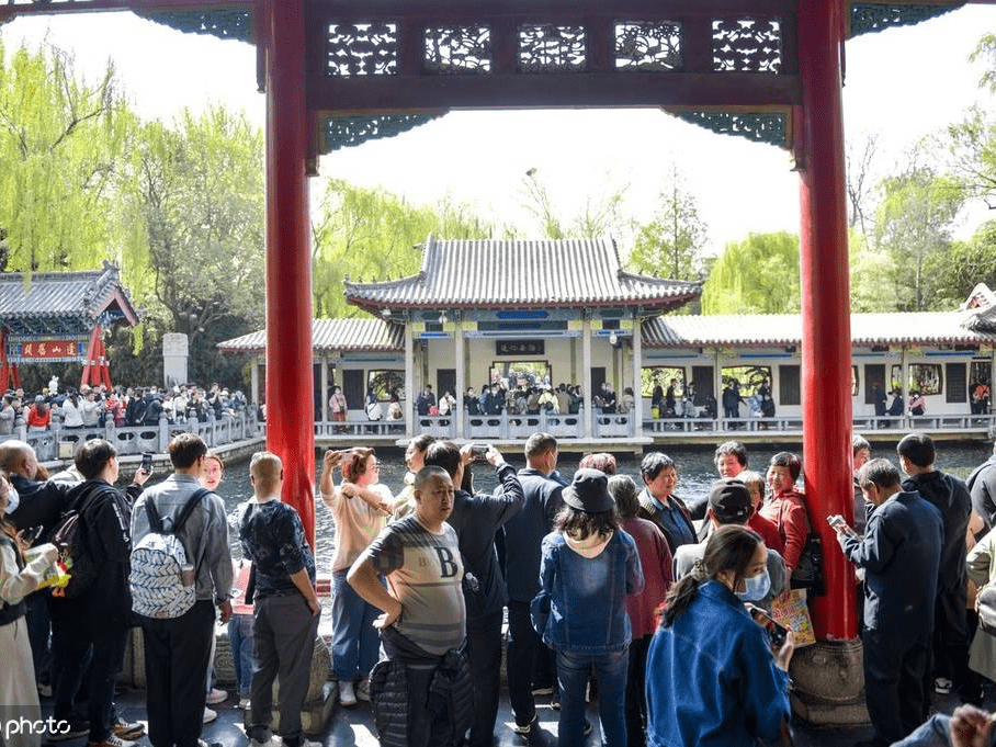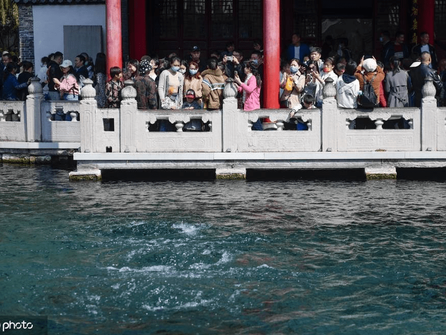 众多外地的散客和团队游客利用最后的免费期,涌入公园内游园赏泉。