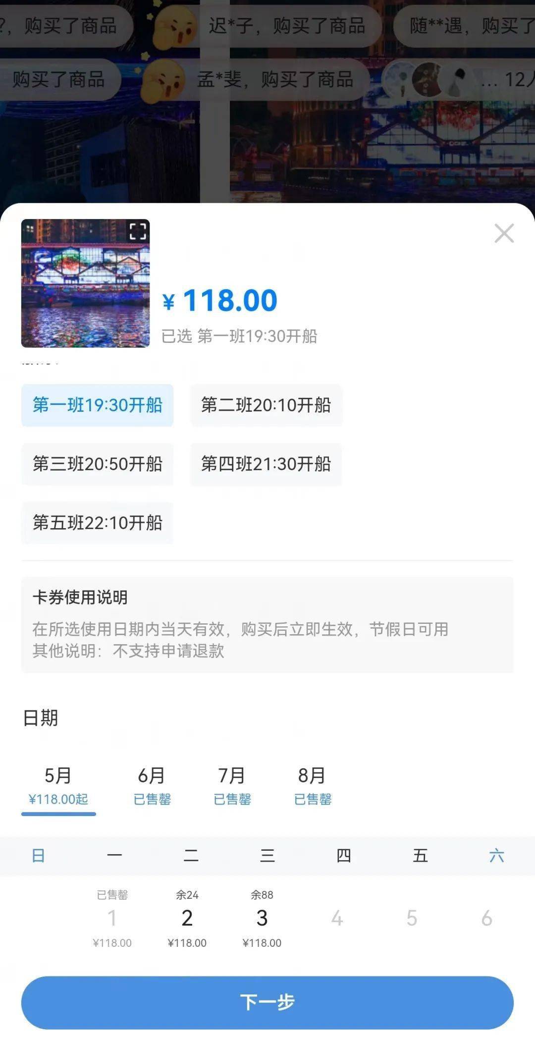 小布在锦江游船线上购票平台看到,5月1日各时间段东门码头游船光影秀船票均已售罄,5月2日至3日仍有少量余票。