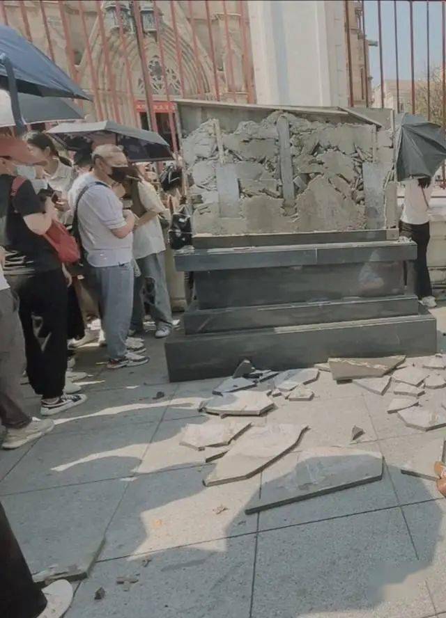 现场目击者告诉记者,4月30日14时40分许,一个小朋友爬到圣心大教堂的文保标志碑上拍照,拍完之后,小孩从碑上向前跳,碑面随之脱落破碎。破碎的水泥块砸到了小孩的妈妈,小孩腿部也擦破流血。