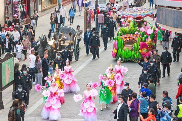 记者在现场了解到,这座大型花车高3.5米,长6.2米,宽 2.4米,以花仙子为主题造型。20名演员身着粉色、绿色等海棠花色系的服装,组成舞蹈队伍,在巡游中根据不同的音乐主题,分六个章节来配合花车进行表演,并不时与市民游客互动,吸引了众多市民游客观看拍照。