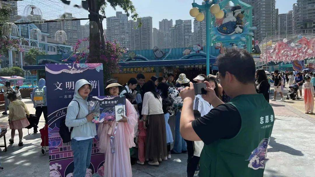 活动期间,来自成都市乡村旅游产业商会志愿者服务队、茶店子街道综合文化活动中心志愿者服务队等机构的志愿者们对景区的游客进行文明告知、提醒、规劝和引导,并给游客发放《文明旅游》宣传册等材料,高峰时段协助景区工作人员维持秩序、捡拾景区内的垃圾杂物等,积极倡导游客养成爱护环境、文明旅游、安全出行的良好习惯,不断增强文明旅游的意识。同时,通过线上邀请有直播经验的优秀导游担任文明旅游志愿者,在网络平台进行直播,线下设置文明旅游志愿者服务站进行解答以及开展有奖知识问答活动。此次活动充分调动了游客们的参与热情,更好地为广大群众传递了文明旅游知识,塑造了健康、文明、环保的生活理念,为进一步深化成都文明城市建设,营造文明、和谐的旅游环境发挥了积极作用。