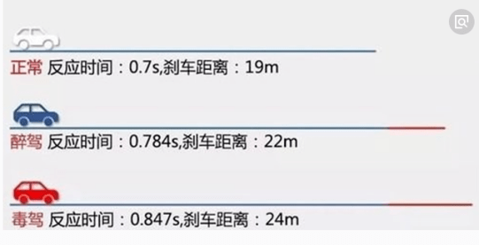 另外,毒品还可能使司机的操作反应变慢。根据英国一项研究,司机酒后驾车比正常反应时间慢12%,而毒驾则比正常反应时间慢21%。正常情况下,司机处理紧急情况,使车辆发生制动的时间是0.7秒;而在毒品作用之下,司机所需要的时间至少是0.847秒。假设车辆是以每小时100公里的速度在行驶,那么正常情况下的刹车距离是19米,而毒驾之下的刹车距离却是24米!5米的差距,往往就是生与死的距离!