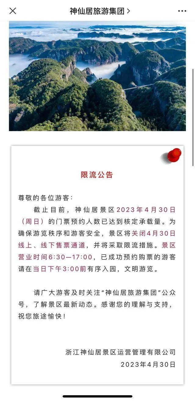 浙江神仙居景区运营管理有限公司今天发布通告说,截至目前,神仙居景区2023年5月1日(周一)的门票预约人数已达到核定承载量。为确保游览秩序和游客安全,景区将关闭5月1日线上、线下售票通道,并将采取限流措施。景区营业时间6:30—17:00,已成功预约购票的游客请在当日下午3:00前有序入园,文明游览。请广大游客及时关注官方公众号,了解景区最新动态。
