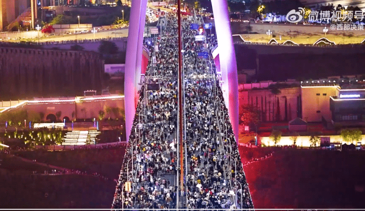 4月29日,重庆洪崖洞景区。晚间,千厮门大桥再次封桥,方便游客打卡拍照。