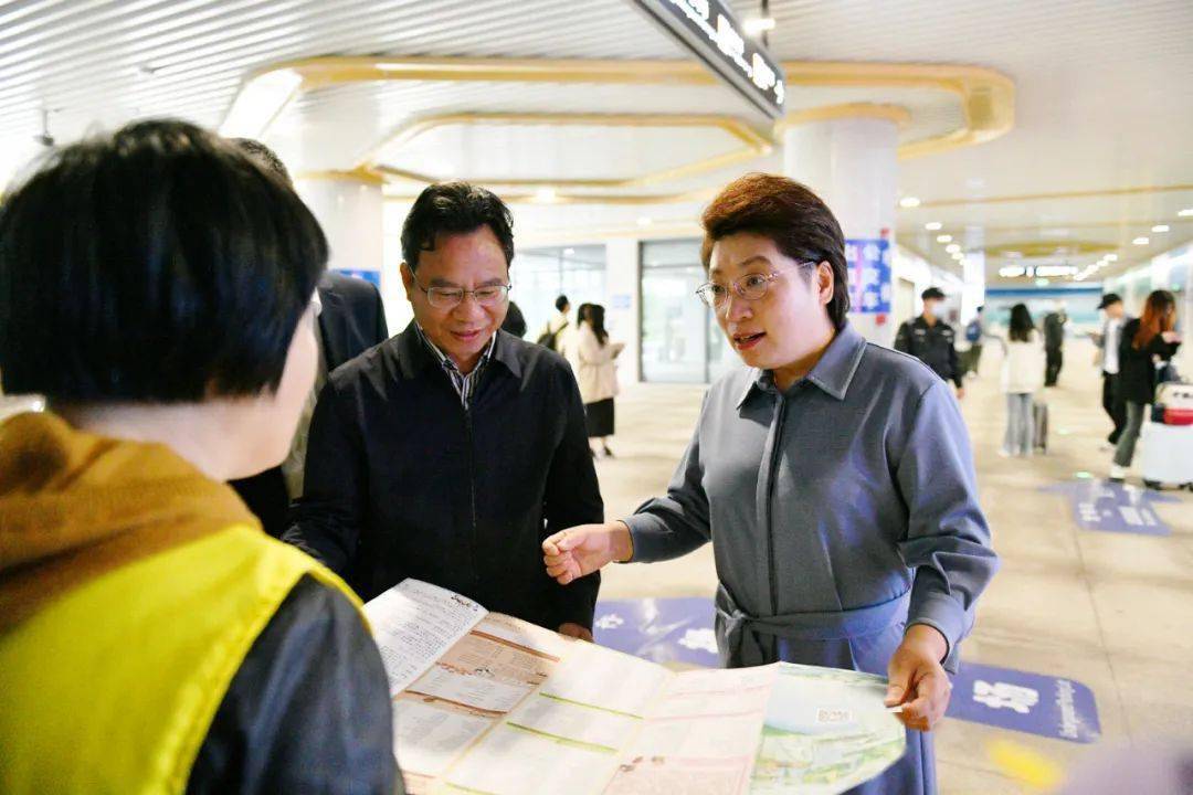 杭台高铁天台山站“五一”期间一票难求。杨玲玲现场查看车站接送分流举措,并与旅游志愿者、出租车司机交流,了解旅游服务措施。她要求相关部门在高铁出站口提供好旅游引导服务,增设更清晰的乘坐出租车标识,让旅客出站即可便捷地到达目的地。