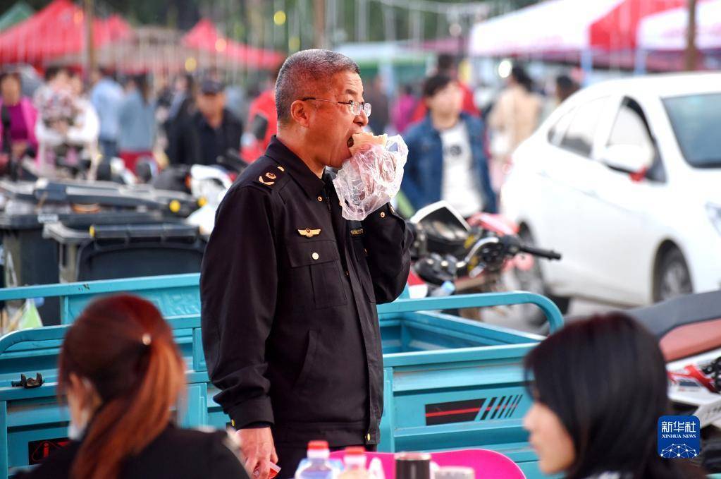 4月30日,在淄博市沂源县悦庄镇下龙巷村烧烤广场,镇市场监督管理所的一名工作人员在值勤现场吃晚餐。