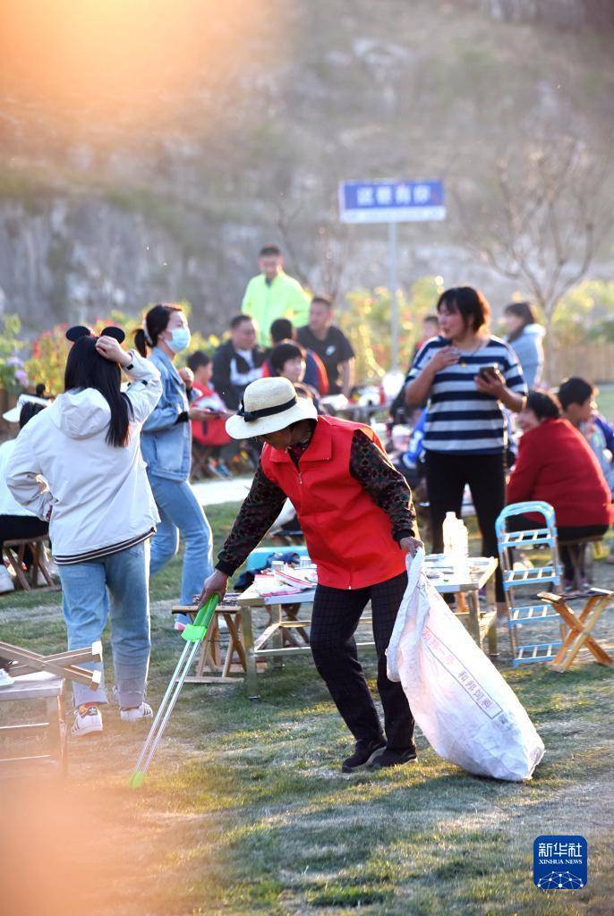 4月30日,在淄博市沂源县悦庄镇下龙巷村烧烤广场,一名志愿者在捡拾垃圾。