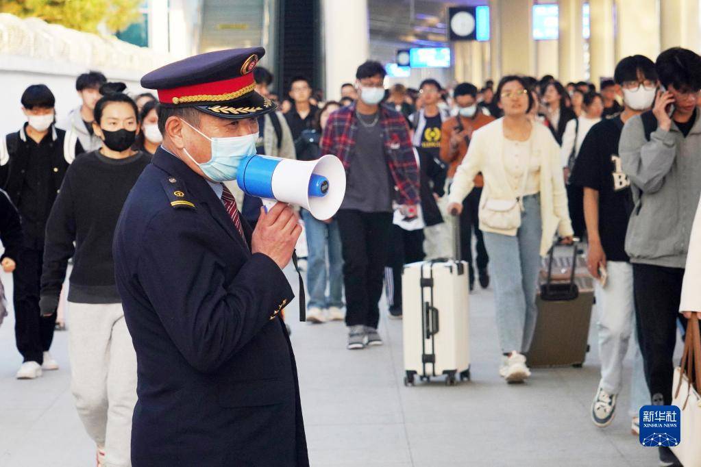 4月29日,淄博火车站工作人员在引导出站旅客。