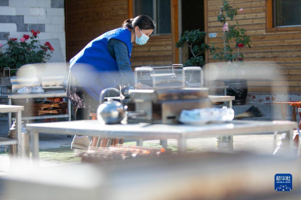 4月30日,一名社区工作者在淄博市高青县田镇街道帮助烧烤摊主摆放餐具。