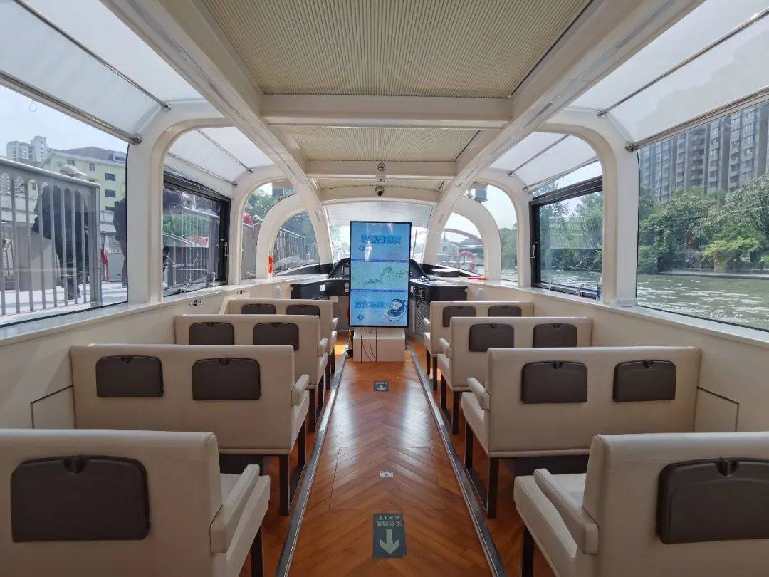 中山公园码头游船到发间隔为30分钟,游船是配备了全景天窗的“时空之梭”游船。据记者现场观察,“时空之梭”游船空间相对较大,可以承载20位游客,视野更加开阔,可以一览两岸风光,因为主动力为纯电动形式,游船的舒适度和体验感也更强。除此之外,游船内还有智能播报显示屏、文创展示台、卫生间等,其中智能播报显示屏中的虚拟导游“悠悠”,会根据游船的位置,以语音和画面的形式实时介绍附近景点,让游客在看景的同时,也可以进一步了解其背后的发展历程和故事。