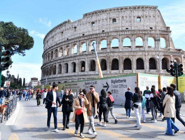 3月26日,游客走过意大利罗马斗兽场的中文指示牌。新华社记者金马梦妮摄