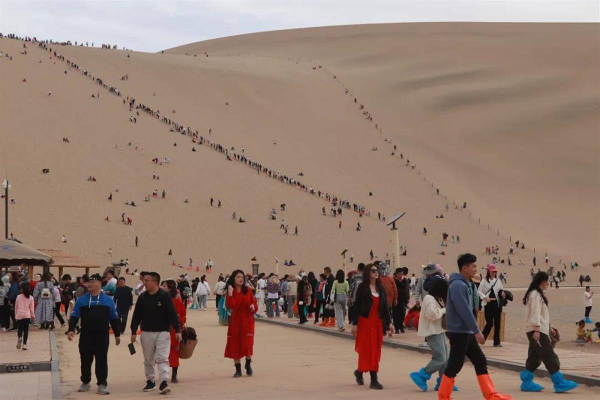 据鸣沙山月牙泉景区介绍,“五一”假期首日,景区游客量即已破万,次日单日接待量飙至26642人,达到今年以来的最高水平。