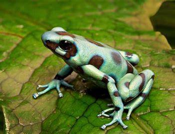 箭毒蛙主要分布于巴西、圭亚那、哥伦比亚和中美洲的热带雨林中,通身鲜明多彩,常为黑与艳红、黄、橙、粉红、绿、蓝的结合,四肢布满鳞纹。其中以柠檬黄最为耀眼和突出。