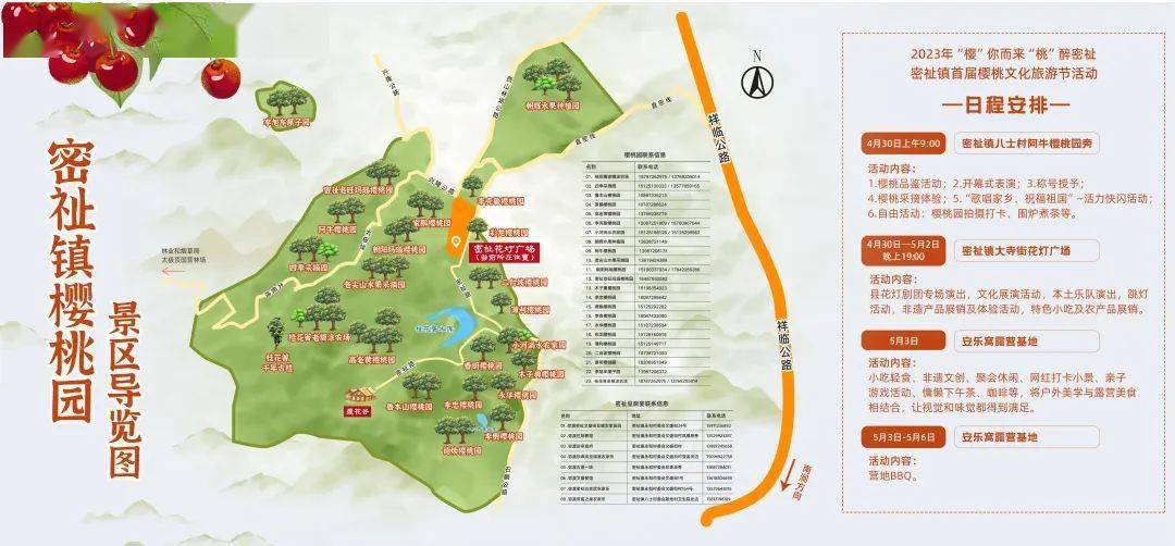 “在‘五一’黄金周来临之际,密祉镇结合樱桃产业优势,举办了密祉镇首届樱桃文化旅游节,今年的活动主题是‘樱’你而来,‘桃’醉密祉。”密祉镇党委书记罗莉说。据罗莉介绍,4月30日至5月6日,在八士村阿牛樱桃园、密祉大寺街花灯广场、安乐窝露营基地,将开展文艺表演、亲子游戏等文化娱乐活动,为游客带来视觉和味觉的双重享受。