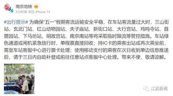 南京地铁:部分站点将临时限流