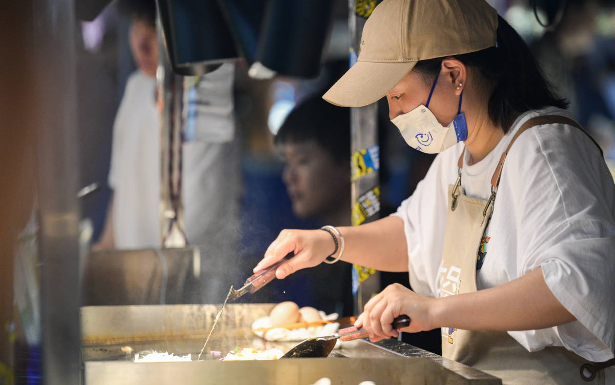 “我就喜欢吃他们家的炸土豆,又脆又甜。”在一家油炸烧烤摊位前,一位游客向其他人点名表扬摊主。摊主笑着回应:“感谢认可!但炸土豆片还要等一下,现在已经卖完了。”