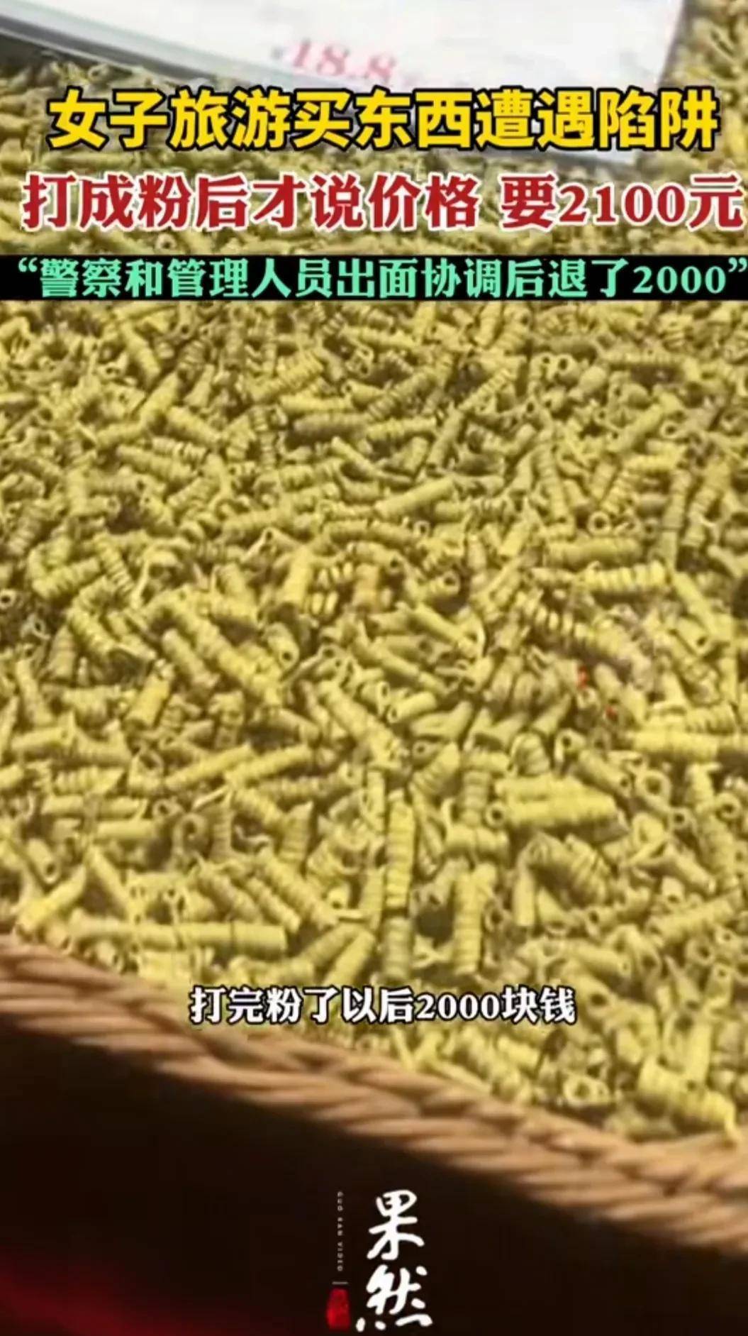 下面这个就是昨天发生在海南的事情,100元东西被打成粉以后竟然索要游客2100元,这简直就是抢劫呀,如果不被曝光出来,不知道有多少游客被坑。先不说东西的价值,客人肯定会事先问好价格,然后再买需要的重量,最后才让商家打成粉,不成想打成又变了2100元的天价,没有哪个游客愿意被这样坑吧!