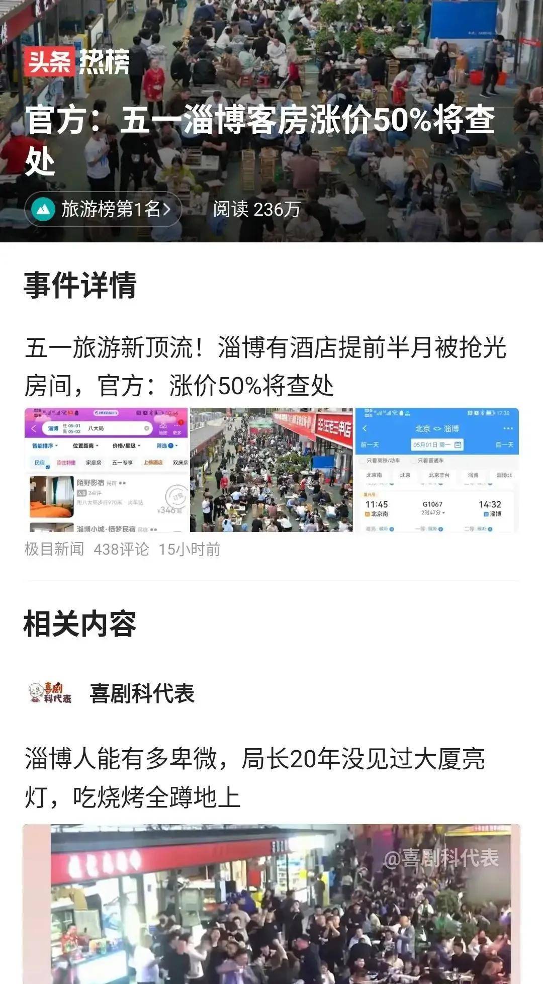 而且更加让人意外的是,淄博官方直接宣布五一期间客房涨价50%将查处,全力备战五一小长假旅游高峰!