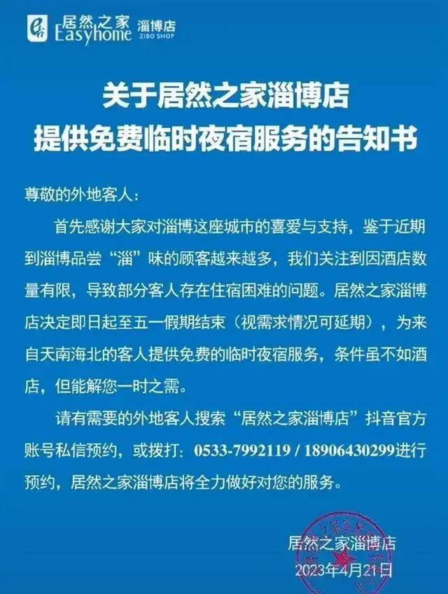 不过,淄博市政府的反应确实太迅速了,同时,也出现了住宿的相关问题,另外,有些商家趁机免费打了一波广告,例如居然之家直接宣布从4月21日起至五一假期结束(视需求情况可延期),为来自天南海北的客人提供免费的临时夜宿服务,为了提升淄博市的形象,可谓是全民上下一心,商家、市民全体出动啊!解决问题与广告效应双赢!各地赶快来抄啊!!!