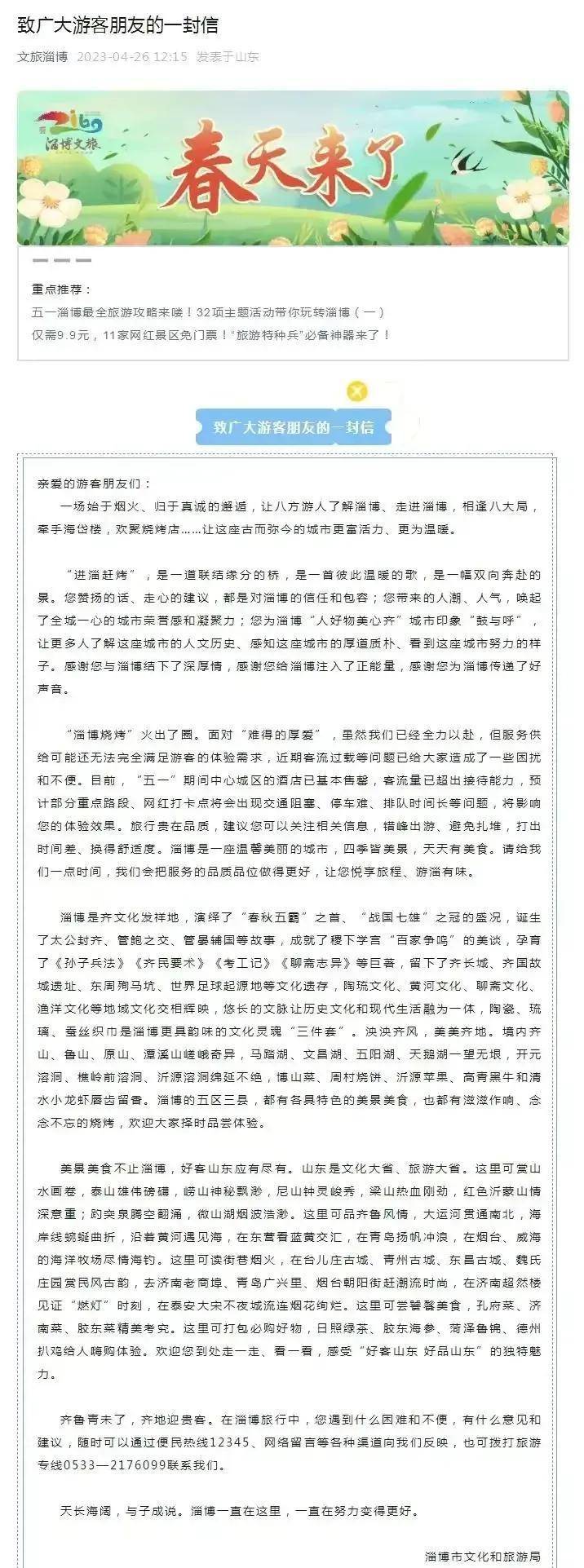 4月26日,淄博文旅局就在公众号“文旅淄博”发布致广大游客朋友们的一封信,内容大致为已经超出城市本身的接待能力,号召大家转转淄博其他县市区,另外,信中还没忘记提醒准备前往淄博吃淄博烧烤的游客去山东其他兄弟地市游玩,错峰出游!!!这格局、这友情、这度量、这胸怀,让我这个旁边泰山脚下的泰安人感动得热泪盈眶啊!!!就冲着这个豪爽劲,也卖力宣传淄博,开辟了淄博烧烤系列文章,欢迎大家拜读!就是阅读量不太高呢!写的也是诚意满满!不知道淄博文旅局能否看到,帮忙点赞一下!嘿嘿!