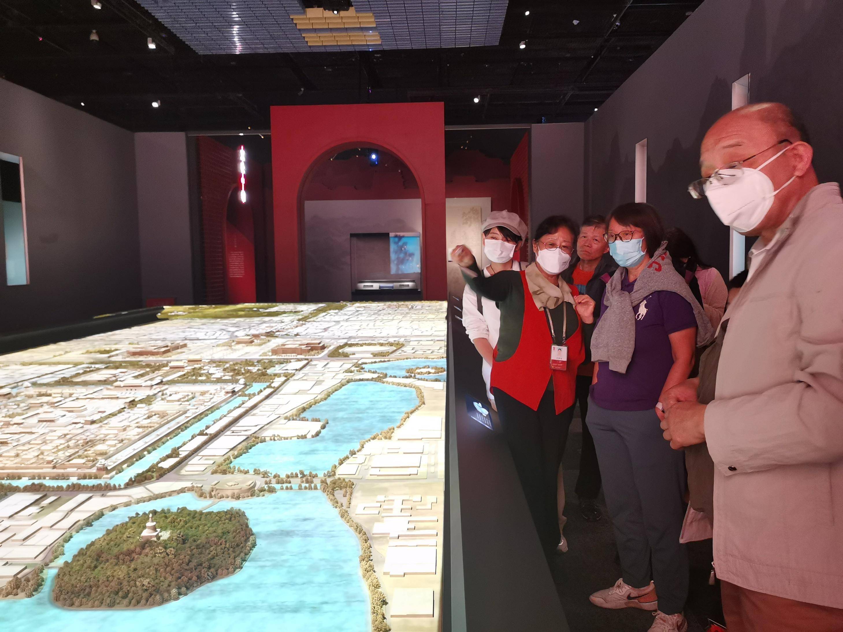 “为什么北京城的建筑是对称的?”“中轴线有多长?”“住在远处的居民能听到钟鼓楼上晨钟暮鼓的声音吗?……”注视着16米长的中轴线全景沙盘,7岁的刘羽佳十分好奇,不禁发出一连串的疑问。“华夏先民在生产生活中掌握了以测日影、观天宇,确定时间节令和空间方位的方法,在此过程中形成了以‘中’为美为尊的观念和对称布局的理想都城范式,7.8公里的中轴线由此而来。”王利一边耐心讲解,一边带领观众在镶嵌着先农坛、天坛、永定门等建筑的沙盘前,一睹中轴线全貌。