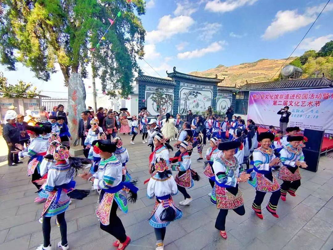 随着非遗保护工作的不断推进,非遗进校园已成为一种常态的教育、保护形式,从娃娃抓起,更好地传承、弘扬非物质文化遗产。近年来,巍山县十分重视打歌文化进校园活动,县文化馆积极组织开展了打歌进校园、进社区、进景区系列活动,通过歌舞乐类非遗活态展演、传承人现场传授技艺等方式,以学生兴趣为导向,播下对打歌文化热爱的种子,让学生们更为直观地了解、认识打歌艺术,以耳濡目染的形式促进传统文化的保护和传承。在各乡镇、社区、街道和学校分发编写出版的《民族歌舞进校园普及教材》《蒙舍遗萃——巍山县非物质文化遗产》《巍山彝族打歌》等非遗资料和普及读物,让群众多渠道、全方位地了解巍山非遗,进一步巩固非遗保护成果。