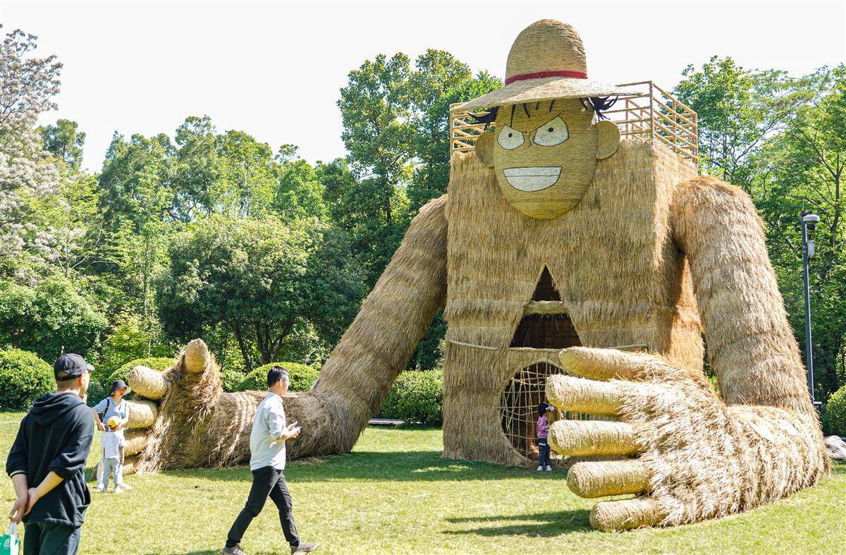 在动漫IP稻草人展区,最引人注目的是一座高8.6米、臂展达12米的巨型路飞形象城堡,游客站在跟前留影,仿佛被路飞的大手臂环抱,进入动漫的二次元空间。此外,还有一对高大的金刚兄弟巍然屹立,其中一只手中还端着高脚酒杯,仿佛要与游客干杯。4米高的稻草龙猫憨态可掬,等待着给游人一个拥抱。一名巨型稻草少年坐在草地上仰望星空,似乎正做着儿时的美梦。神态各异、模拟农人耕作形态的稻草人,演绎着春种秋收的农耕故事,再现了农耕时期人与自然的密切联系。