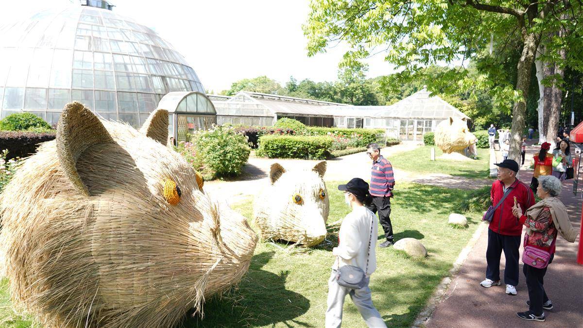 据悉,稻草人展主要集中在该园的中心草坪、菊圃区域,包括动物、动漫卡通人物、农耕文化等主题。共有15组稻草艺术作品、28种形态各异的稻草人。由来自全国各地的数十位大地艺术家,以湖北的芦苇和稻草为原材料,通过堆扎、绳编等方式制作而成。