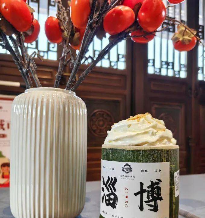 比如淄博竹筒奶茶,25r,绿色竹筒杯,奶油雪山顶,上面贴着“ 淄博 ”2个大字,拍照特别好看,尤其是配上钟书阁内部的古风环境拍照更好看。