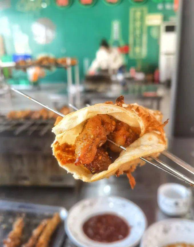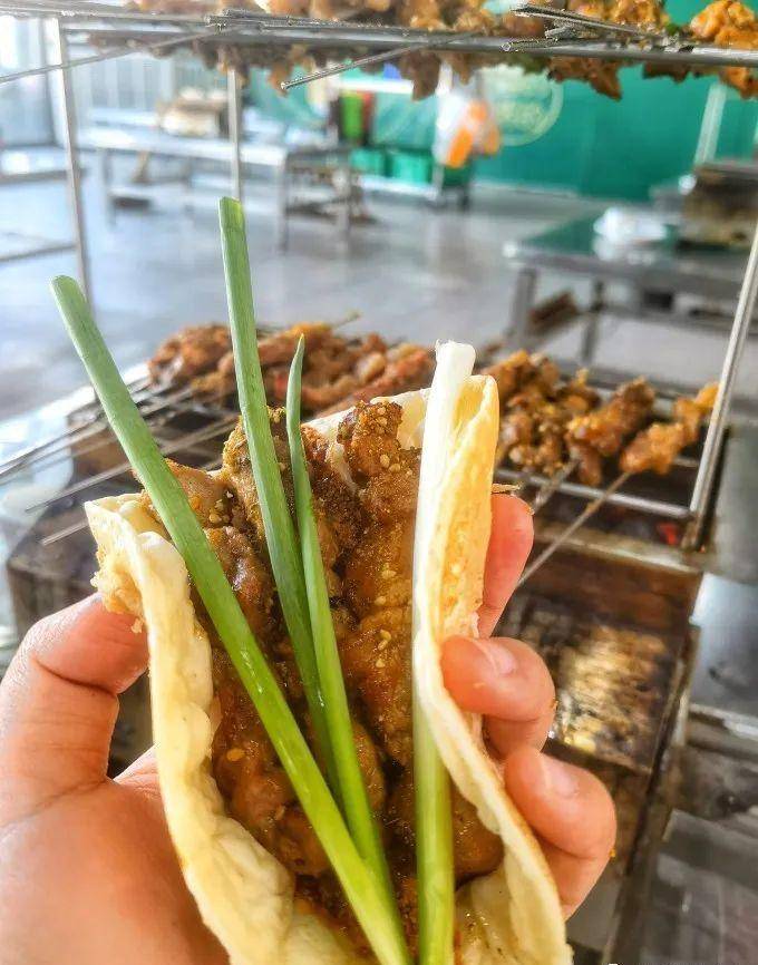 小饼一折一蘸,放上肉串一撸,在骨碌碌的肉块上再放上几根青翠的小葱,那过程,忒治愈,那味道,忒美。