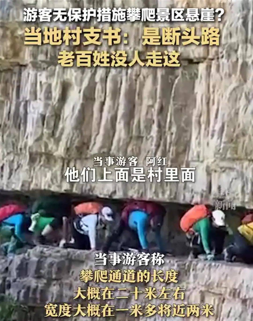 但这次,无保护措施过悬崖的方式,“太拼了”。根据当地人的介绍,这是一个平时当地老百姓都不会选择的路线,却被旅游当成了“野生景点”。这也意味着,这个所谓的景点,没有任何保护措施,甚至因为人迹罕至,可能连基本的安全提示都没有。游客如果缺乏足够的体力和专业技能,贸然前往,发生危险事故的概率是很高的。