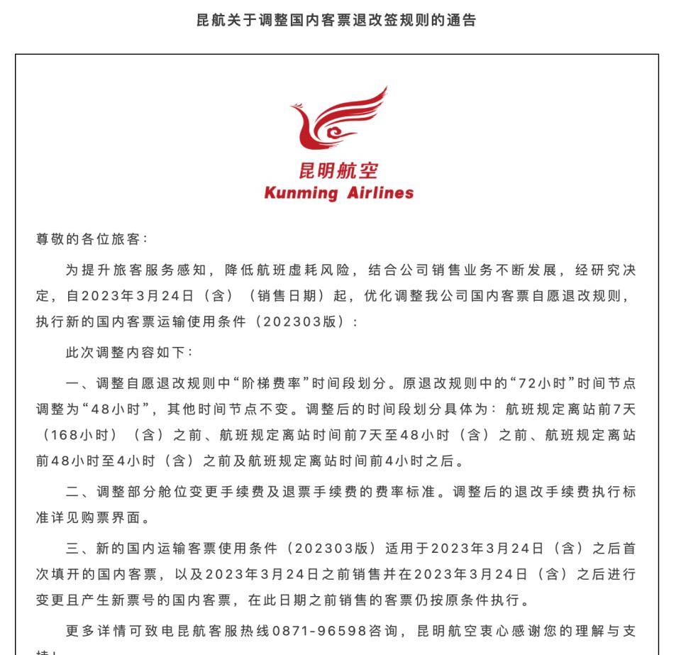 3月29日,昆明航空发布关于调整国内客票退改签规则的通告称,为提升旅客服务感知,降低航班虚耗风险,结合公司销售业务不断发展,经研究决定,自3月24日(含)(销售日期)起,优化调整公司国内客票自愿退改规则,执行新的国内客票运输使用条件(202303版),此次调整内容如下: