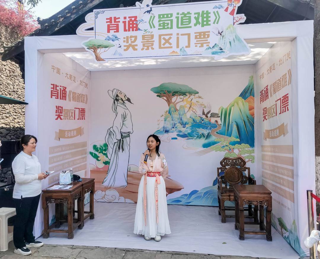 据了解,近年来,剑阁县坚持“以文塑旅 以旅彰文”,推进文化和旅游深度融合发展。自今年1月1日起,剑门关景区推出了“背诵《蜀道难》 奖游剑门关”的长期优惠活动,游客只要能全文背出《蜀道难》,便可以免费获得景区门票1张。