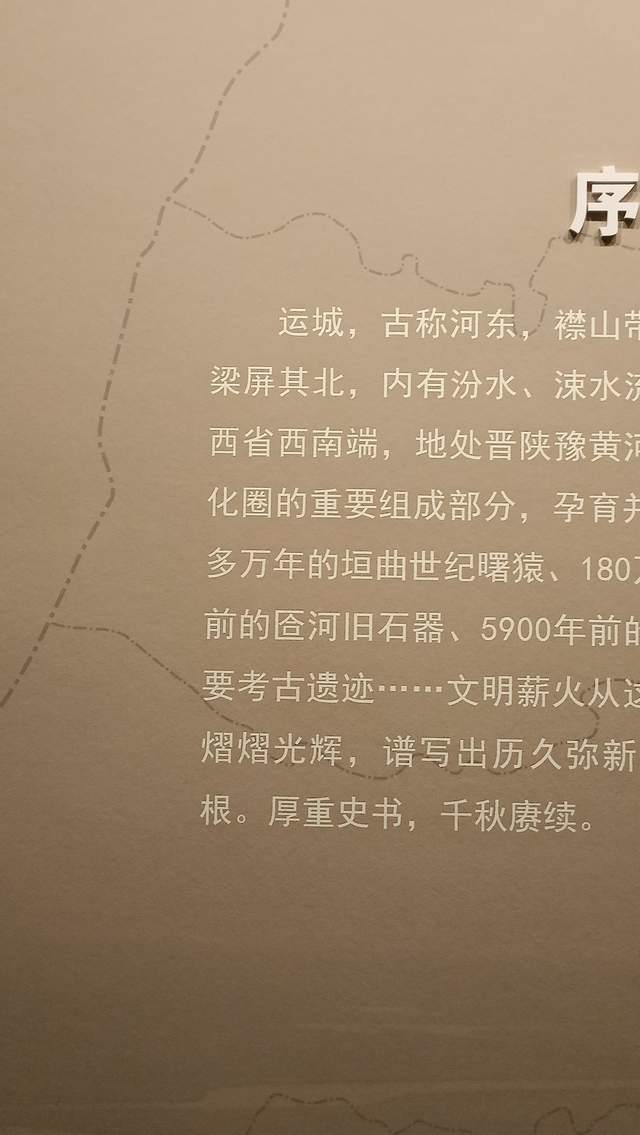 序言大厅设有文化主题浮雕墙,雕刻着世纪曙猿、西侯度用火、后稷教民稼穑、舜帝抚琴吟唱南风歌、嫘祖养蚕缫丝衣披天下、大禹开凿龙门疏导洪水等;浮雕墙相对的六根文化艺术柱上镶嵌有商代兽面纹、西周凤鸟纹等运城重要文物纹饰铜雕;大厅屏风雕刻有“明四家”之一沈周所绘的《着色山水图卷》和西汉辞赋家扬雄所作的《河东赋》。展厅由6个历史专题和4个建设成就专题构成。