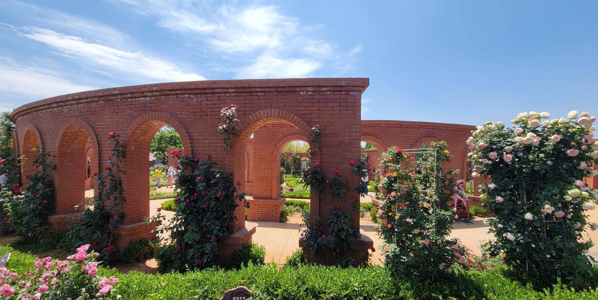 园里还建有月季拱门。月季起源于中国,于上世纪中期在法国兴盛。结合中西合璧的主题,月季园的这一景观中加入了欧洲建筑元素,再加上红砖元素,不仅与庾园中的红楼红瓦交相呼应,更展现出建设者的一颗赤诚中国心。