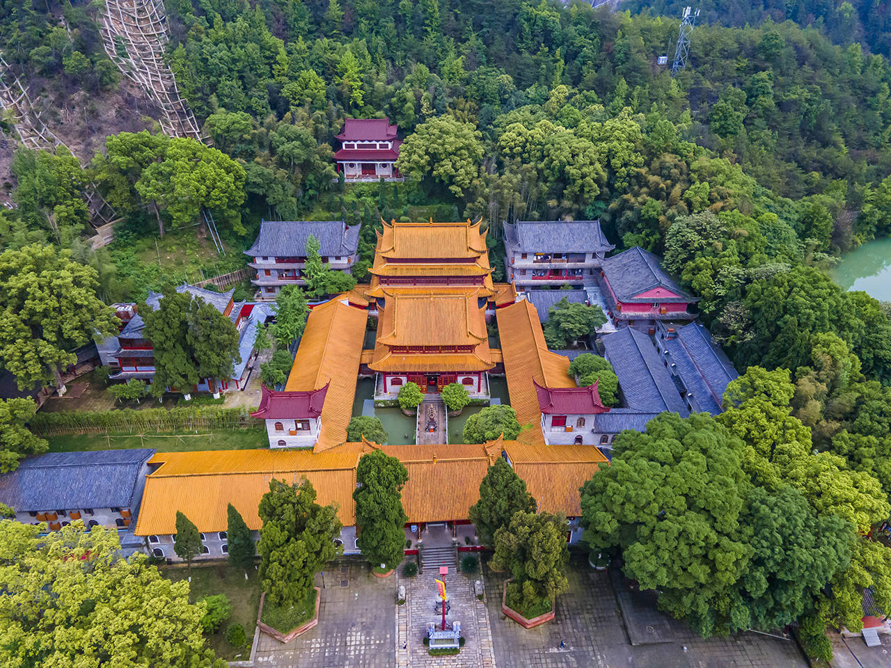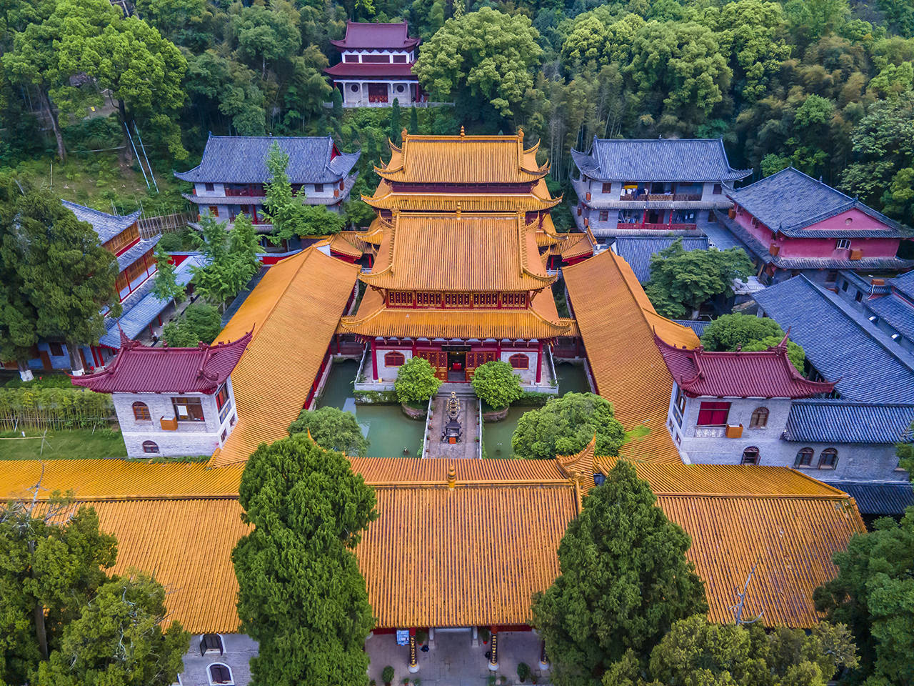 寺内小桥流水,池水青绿,有种徜徉在江南园林中的雅趣。俯瞰寺庙,金色的琉璃瓦辉映着青翠的林木,纵使世事变迁,最初的寺庙已不复存在,在这里产生的哲思,在其中传播的文化却早已生根发芽,生生不息。