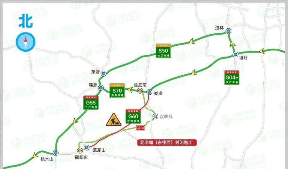 3月24日至4月23日(遇雨天顺延),G60沪昆高速娄底至范家山路段东往西方向封闭式施工,西往东方向正常通行,请有出行需要的驾驶员提前规划路线,途经此处时根据交通指示绕行。