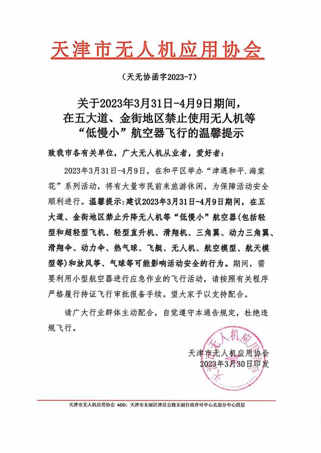 3月30日晚,“天津和平”发布关于近期五大道、金街地区无人机等“低慢小”航空器禁飞的温馨提示: