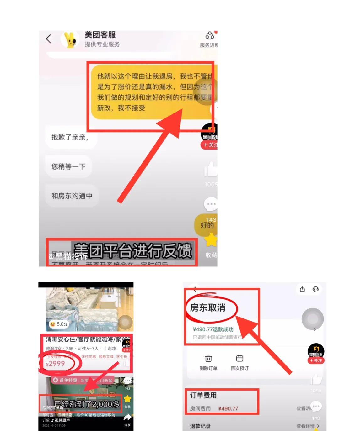 【9】案例二:黑猫投诉一则视频,游客3月份预定了烟台民宿(4月29日至5月1日)每天房费为490.77元,然而4月8日民宿房东电话通知游客,之前预订五一假期房间由于漏水无法入住,民宿也没有其他房间给游客入住,游客必须取消订单,游客深信不疑,用朋友帐号查询该民宿,并电话询问对方表示有房,而叫自己取消订单房子已经涨价2999元,游客向美团投诉,美团协商之后民宿同意游客继续入住,间隔10天之后,民宿老板再次电话通知游客,说他们预定房间价格太低,赚得太少,房东单方面强制取消订单,游客再次向美团投诉,美团安排烟台当地其他民宿给游客入住,愿意首晚赔偿736元,游客无奈最终取消烟台行程,游客与美团协商退一赔三,美团方表示无法满足这个条件,事情冲上热搜(网友评论:好客山东,变刺客)。
